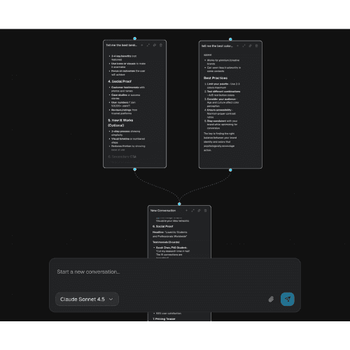Drag, drop, and connect AI conversation nodes visually on an infinite canvas. Build step-by-step reasoning and explore multiple perspectives.